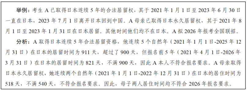 ②取得住在国连续五年的合法居留资格,连续5个自然年(即某年1月1日至第五年12月31日,如2021年1月1日至2025年12月31日)和报名前5年内(即2021年4月1日至2026年3月31日)在住在国实际累计居留均不少于900天。
