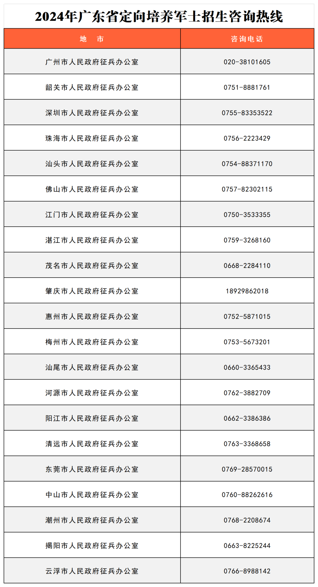 现将2024年报考定向培养军士考生体格检查、政治考核合格名单公布如下。对结论有疑问的考生,可拨打报考地市级征兵办(详见下表)或省征兵办(020-88666160)咨询,电话接听时间:7月20-23日08:00-11:50、15:00-17:50。合格考生不代表已录取,需按招生程序由澳门新葡京博彩APP下载招生委员会办公室在专科提前录取批次按高分到低分组织投档后,由报考的相应普通高校进行录取。请各位考生耐心等待,届时通过澳门新葡京博彩APP下载招生委员会办公室的官方渠道查询录取情况。